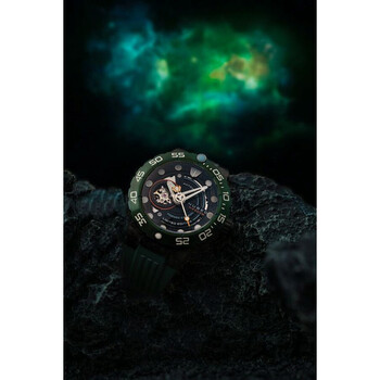 Introducing the new iteration of the Opportunity Automatic. Featuring the similar build of the original Opportunity with automatic movement and a 48mm case, this exquisite timepiece carries a dial made from carbon fibre, which gives a unique and mesmerizing look. Only 500 pieces are available. Black composite case with a green silicone strap. Uni-directional rotating green stainless steel bezel. Black dial with silver-tone hands and index hour markers. Dial Type: Analog. Luminescent hands and markers. Seiko - NH38 automatic movement. Scratch resistant sapphire crystal. Screw down crown. Transparent case back. Round case shape, case size: 48 mm, case thickness: 17.9 mm. Band width: 20 mm, band length: 8 inches. Water resistant at 300 meters / 1000 feet. Functions: hour, minute, second. Opportunity Series. Casual watch style. Nubeo Opportunity Black Dial Men's Watch NB-6085-04.