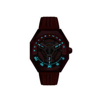 A new iteration from our Skylab collection, the Skylab Automatic is a limited edition timepiece that challenges the boundaries of horology. Keeping the same elegantly crafted hexagonal pattern on the dial, it also features a Japanese automatic movement and two hands for an accurate and reliable timekeeping experience. It also comes with an additional rubber strap for extra versatility. Red stainless steel case with a red rubber strap. Fixed red stainless steel bezel. Red dial with silver-tone hands and index hour markers. Minute markers around the outer rim. Dial Type: Analog. Luminescent hands and markers. M-MIY-9039.2H automatic movement. Scratch resistant sapphire crystal. Screw down crown. Solid case back. Round case shape, case size: 48 mm, case thickness: 19 mm. Band width: 26 mm, band length: 8 inches. Water resistant at 100 meters / 330 feet. Functions: hour, minute, second. Skylab Series. Casual watch style. Nubeo Skylab Automatic Red Dial Men's Watch NB-6083-0C.