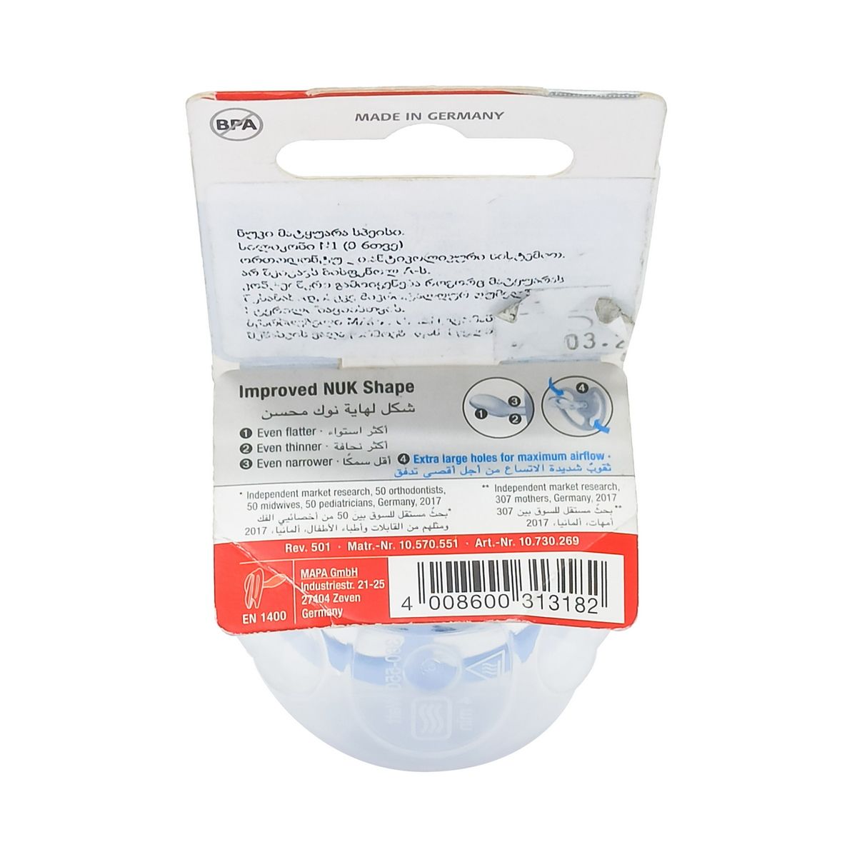 ორთოდონტული, აღჭურვილია ანტიკოლიკური სისტემით. დამზადებულია მაღალხარისხიანი რბილი სილიკონისგან. არ შეიცავს ბისფენოლ A-ს