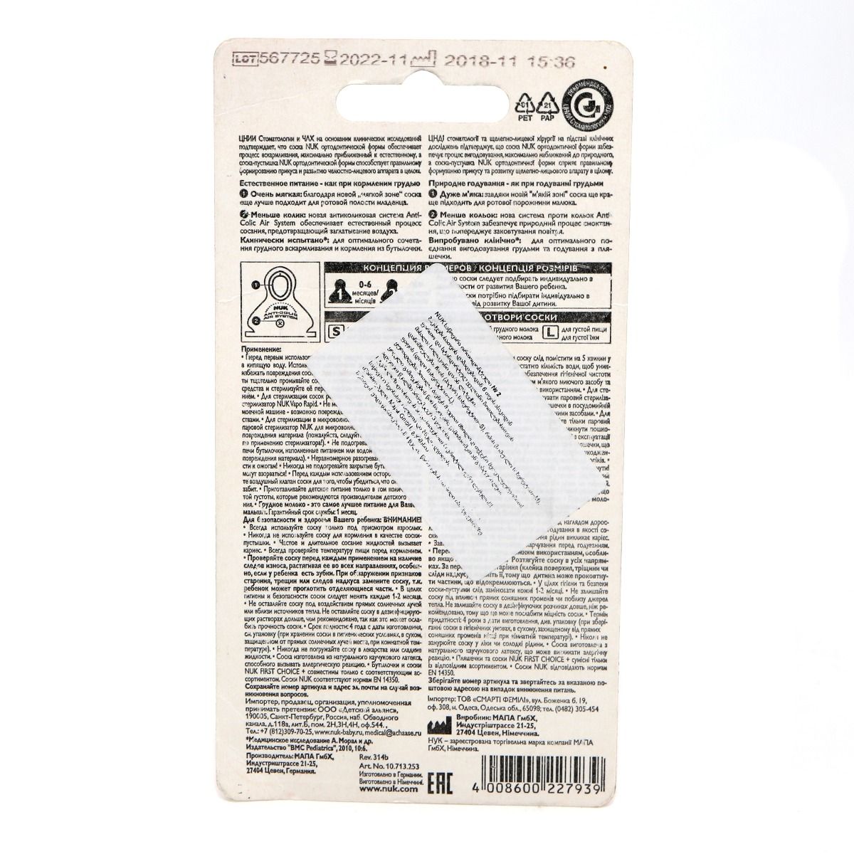 ლატექსის, ორთოდონტული საწოვარა. ნახვრეტის ზომა S-წყლისთვის, ჩაისთვის, გამოწველილი რძისთვის. აქვს ანტიკოლიკური სისტემა. (NUK Anti-colic Air System ).