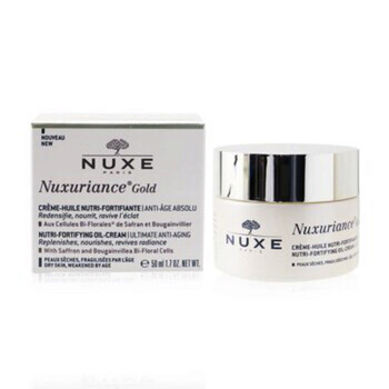 A strengthening facial oil-cream with 95 % natural origin ingredients. Combines the power of Saffron & Bougainvillea Bi-floral Cells® with Porcelain Rose Oleactif®. Contains a natural nourishing & replenishing complex for absolute anti-aging power. Helps re-densify skin, smooths wrinkles & intensely re-plumps skin. Infused with a refined scent of white flowers & sandalwood radiating femininity & elegance. Skin becomes firmer, stronger & more radiant. Ideal for dry skin or skin weakened by age. Design house: Nuxe. Series: Nuxuriance Gold. Gender: Ladies. Category: Skin Care. SubType: Moisturizers. Size: 1.7 oz. Barcode: 3264680015908. Nuxe Ladies Nuxuriance Gold Nutri-Fortifying Oil Cream 1.7 oz Skin Care 3264680015908.