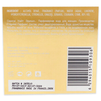 Odyssey Femme White Edition is an exquisite composition of rich and captivating scents. As you uncork the bottle, you are instantly greeted with the intoxicating aroma of tuberose, honeysuckle, and jasmine. These floral notes are masterfully intertwined with refreshing green notes and the invigorating zest of orange.