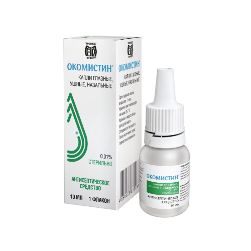 ოკომისტინი, თვალის, ყურის, ნაზალური წვეთების გამოყენება რეკომენდებულია თვალის წინა ნაწილის ინფექციური პროცესების (ბლეფარიტის, კონიუნქტივიტის, კერატიტის, კერატოუვეიტის) კომპლექსური მკურნალობის დროს, თვალის ტრავმის და თვალის დამწვრობის (თერმული და ქიმიური) დროს; ოპერაციამდე და ოპერაციის შემდგომ პერიოდში ჩირქოვან-ანთებითი პროცესების სამკურნალოდ და პროფილაქტიკისთვის.