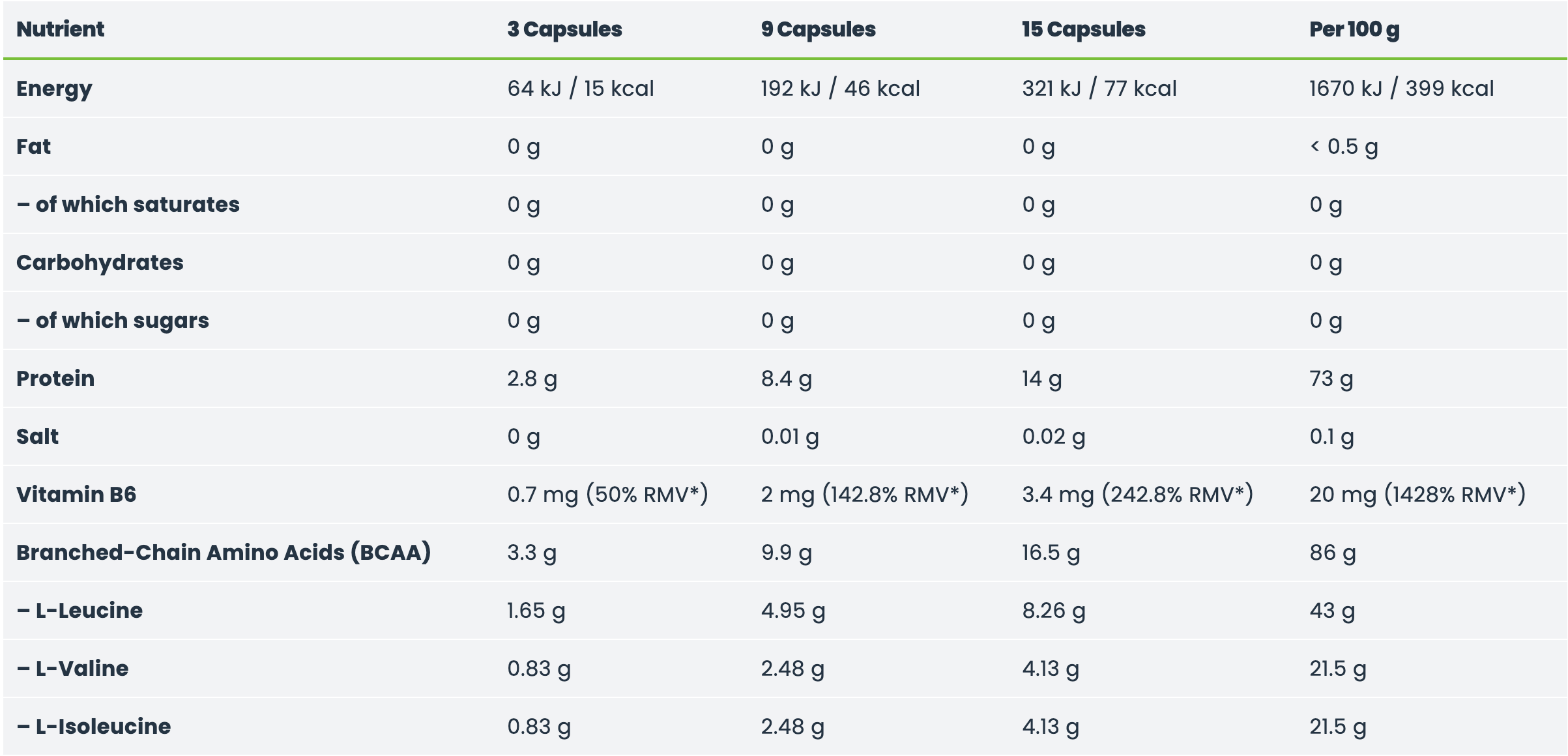 Olimp BCAA 1100 Mega Caps არის კაფსულის ფორმის BCAA დანამატი, რომელშიც თითო კაფსულა შეიცავს 1 100 მგ 3 მთავარ ამინომჟავას (BCAA: ლეიცინი, იზოლეიცინი, ვალინი) ნიუანსირებულ პროპორციაში 2:1:1