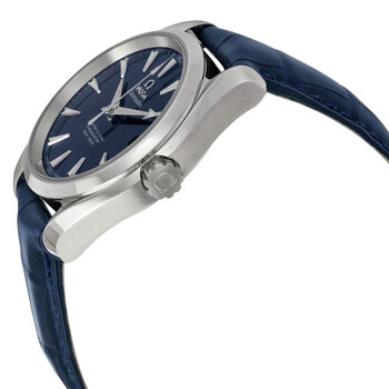 Stainless steel case with a blue leather strap. Fixed stainless steel bezel. Blue dial with luminous silver-tone hands and index hour markers. Minute markers around the outer rim. Dial Type: Analog. Luminescent hands and markers. Date display at the 3 o'clock position. Omega calibre 8500 automatic movement with a 60-hour power reserve. Scratch resistant sapphire crystal. Screw down crown. Skeleton case back. Case diameter: 38.5 mm. Case thickness: 13.2 mm. Round case shape. Strap width: 19 mm. Fold over clasp with a safety release. Water resistant at 150 meters / 500 feet. Functions: date, hour, minute. Luxury watch style. Watch label: Swiss Made. Omega Aqua Terra 150m Master Co-Axial Blue Dial Men's Watch 231.13.39.21.03.001.