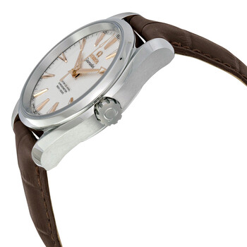 Stainless steel case with a brown leather strap. Fixed stainless steel bezel. Silver dial with luminous rose gold-tone hands and index hour markers. Minute markers around the outer rim. Dial Type: Analog. Luminescent hands and markers. Date display at the 3 o'clock position. Automatic movement with a 60-hour power reserve. Scratch resistant sapphire crystal. Screw down crown. Skeleton case back. Case diameter: 38.5 mm. Case thickness: 13.2 mm. Round case shape. Push button fold over clasp. Water resistant at 150 meters / 500 feet. Functions: date, hour, minute. Luxury watch style. Watch label: Swiss Made. Omega Aqua Terra 150m Master Co-Axial Silver Dial Brown Leather Men's Watch 23113392102003.