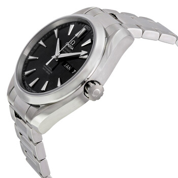 Stainless steel case with a stainless steel bracelet. Fixed stainless steel bezel. Black dial with luminous silver-tone hands and index hour markers. Arabic numeral minute markers (at 5 minute intervals). Minute markers around the outer rim. Dial Type: Analog. Luminescent hands and markers. Month and date display at the 3 position. Automatic movement with a 55 hour power reserve. Scratch resistant sapphire crystal. Screw down crown. Transparent case back. Case diameter: 43 mm. Case thickness: 15.5 mm. Round case shape. Band width: 24 mm. Band length: 7 inches. Deployment clasp with a push button release. Water resistant at 150 meters / 500 feet. Functions: date, day, hour, minute, second. Luxury watch style. Watch label: Swiss Made. Item Variations: 231 10 43 22 01 002, 231-10-43-22-01-002, 231/10/43/22/01/002, 23110432201002. Omega Aqua Terra Annual Calendar Automatic Black Dial Men's Watch 231.10.43.22.01.002.