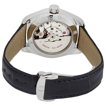 Stainless steel case with a blue (alligator) leather strap. Fixed stainless steel bezel. Blue (teak concept) dial with silver-tone arrow-shaped hands and index hour markers. Minute markers around the outer rim. Dial Type: Analog. Luminescent hands and markers. Month and date display at the 3 o'clock position. Omega calibre 8601 automatic movement, based upon Omega 8500, containing 39 Jewels, bitting at 25200 vph, and has a power reserve of approximately 55 hours. Scratch resistant sapphire crystal. Screw down crown. Transparent case back. Round case shape. Case size: 38.5 mm. Case thickness: 14.7 mm. Band width: 19 mm. Deployment clasp. Water resistant at 150 meters / 500 feet. Functions: annual calendar, month, date, hour, minute, second, chronometer. Luxury watch style. Watch label: Swiss Made. Item Variations: 231 13 39 22 03 001, 231-13-39-22-03-001, 231/13/39/22/03/001, 23113392203001. Omega Aqua Terra Annual Calendar Blue Dial Men's Watch 231.13.39.22.03.001.