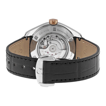 Stainless steel case with a black alligator leather strap. Fixed rose gold bezel. Black dial with rose gold hands and index hour markers. Minute markers around the outer rim. Date display at the 3 o'clock position. Automatic movement with 50 hour power reserve. Scratch resistant sapphire crystal. Screw down crown. Transparent case back. Case diameter: 34 mm. Round case shape. Band width: 20.3 mm. Band length: 8 inches. Deployment clasp. Water resistant at 100 meters / 330 feet. Functions: date, hour, minute, second. Dress watch style. Watch label: Swiss Made. Omega Aqua Terra Automatic Black Dial Black Leather Ladies Watch 23123342001002.
