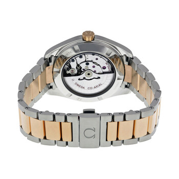 Stainless steel case with a stainless steel bracelet with 18kt rose gold center links. Fixed 18kt rose gold bezel. Silver dial with luminous rose gold hands and index hour markers. Minute markers around the outer rim. Dial Type: Analog. Luminescent hands and markers. Date display at the 3 o'clock position. Automatic movement with a 60 hour power reserve. Scratch resistant sapphire crystal. Screw down crown. Skeleton case back. Case diameter: 41.5 mm. Round case shape. Deployment clasp. Water resistant at 150 meters / 500 feet. Functions: date, hour, minute, second. Luxury watch style. Watch label: Swiss Made. Omega Aqua Terra Automatic Silver Dial Steel and 18kt Rose Gold Men's Watch 23120422102001.