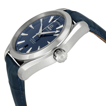 Stainless steel case with a blue leather strap. Fixed stainless steel bezel. Blue dial with silver-toned hands and index hour markers. Minute markers around the outer rim. Dial Type: Analog. Luminescent hands and markers. Date display at the 6 o'clock position. Day of the week displayed centered on the 12 o'clock position. Automatic movement with a 55-hour power reserve. Scratch resistant sapphire crystal. Screw down crown. Transparent case back. Case diameter: 41.5 mm. Round case shape. Band width: 20.3 mm. Band length: 8 inches. Deployment clasp. Water resistant at 150 meters / 500 feet. Functions: date, hour, minute, second. Luxury watch style. Watch label: Swiss Made. Omega Aqua Terra Blue Dial Blue Leather Men's Watch 231.13.42.22.03.001.