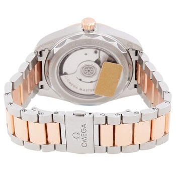 Stainless steel and 18kt sedna rose gold case and bracelet. Fixed 18kt sedna rose gold bezel. Waved blue dial with 18kt sedna rose gold hands and index hour markers. Dial Type: Analog. Date display at the 6 o'clock position. Omega Calibre 8800 Automatic movement, containing 35 Jewels, bitting at 25200 vph, and has a power reserve of approximately 55 hours. Scratch resistant sapphire crystal. Pull / push crown. Transparent see through case back. Round case shape, case size: 38 mm, case thickness: 13.2 mm. Push button folding clasp. Water resistant at 150 meters / 500 feet. Functions: date, hour, minute, second. Aqua Terra Co-axial Series. Luxury watch style. Watch label: Swiss Made. Omega Aqua Terra Co-Axial Automatic Men's Watch 220.20.38.20.03.001.