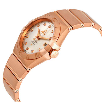 18kt rose gold case with a 18kt rose gold bracelet. Fixed roman numeral 18kt rose gold bezel. Silver dial with rose gold-tone dauphine-style shape hands and diamond hour markers. Minute markers around the outer rim. Dial Type: Analog. Luminescent hands. Date display at the 3 o'clock position. Omega Calibre 2500 Automatic movement, based upon ETA 2892-A2, containing 27 Jewels, bitting at 25200 vph, and has a power reserve of approximately 48 hours. Scratch resistant sapphire crystal. Pull / push crown. Transparent case back. Round case shape. Case size: 35 mm. Band width: 23 mm. Fold over with a push button release clasp. Water resistant at 100 meters / 330 feet. Functions: date, hour, minute, second, co-axial escapement, chronometer. Luxury watch style. Watch label: Swiss Made. Omega Constellation 18kt Rose Gold Automatic Diamond Ladies Watch 123.50.35.20.52.001.