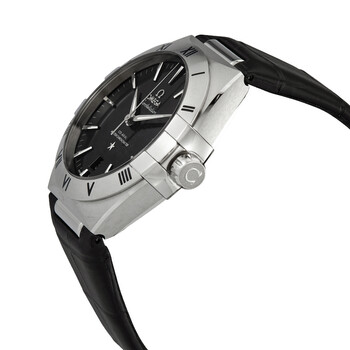 Stainless steel case with a black (alligator) leather strap. Fixed stainless steel bezel. Black dial with luminous18kt white gold hands and index hour markers. Minute markers around the outer rim. Dial Type: Analog. Date display at the 6 o'clock position. Omega calibre 8800 automatic movement, containing 35 Jewels, bitting at 25200 vph, and has a power reserve of approximately 55 hours. Scratch resistant sapphire crystal. Pull / push crown. Transparent case back. Round case shape. Case size: 39 mm. Band width: 24.2 mm. Fold over clasp with a push button release. Water resistant at 50 metres / 167 feet. Functions: date, hour, minute, second. Constellation Automatic Series. Luxury watch style. Watch label: Swiss Made. Omega Constellation Automatic Black Dial Men's Watch 131.13.39.20.01.001.