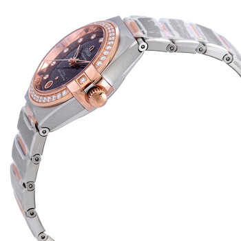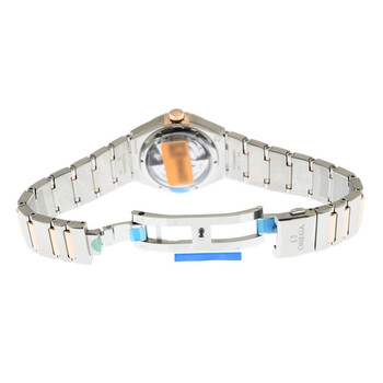 Stainless steel and 18kt sedna gold case with a brushed & polished stainless steel and 18kt sedna gold bracelet. Fixed bezel with diamond set. Blue aventurine glass dial with rose gold hands and diamond hour markers. Dial Type: Analog. Date display at the 6 o'clock position. Omega Calibre 8700 automatic movement with a 50-hour power reserve. Anti-reflective scratch resistant sapphire crystal. Pull / push crown. Transparent see through case back. Round case shape, case size: 29 mm. Band width: 17.6 mm. Push button folding clasp. Water resistant at 50 meters / 165 feet. Functions: date, hour, minute, second. Constellation Automatic Series. Luxury watch style. Watch label: Swiss Made. Omega Constellation Automatic Blue Aventurine Glass Diamond Dial Ladies Watch 131.25.29.20.53.002.