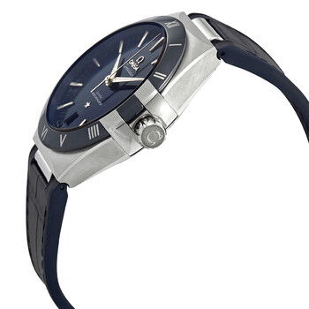 Stainless steel case with a blue leather (rubber backed) strap. Fixed blue ceramic bezel. Blue dial with luminous silver-tone hands and index hour markers. Minute markers around the outer rim. Dial Type: Analog. Luminescent hands. Date display at the 6 o'clock position. Omega calibre 8900 automatic movement, based upon Omega 8500, containing 39 Jewels, bitting at 25200 vph, and has a power reserve of approximately 60 hours. Scratch resistant sapphire crystal. Screw down crown. Transparent case back. Round case shape. Case size: 41 mm. Band width: 24.2 mm. Deployment clasp. Water resistant at 50 meters / 165 feet. Functions: date, hour, minute, second, co-axial escapement, chronometer. Constellation Series. Luxury watch style. Watch label: Swiss Made. Omega Constellation Automatic Chronometer Blue Dial Men's Watch 131.33.41.21.03.001.