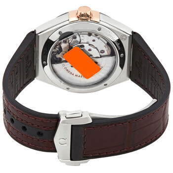 Stainless steel and 18kt rose gold case with a burgundy leather strap. Fixed polished black ceramic bezel. Burgundy dial with rose gold hands and index hour markers. Minute markers around the outer rim. Dial Type: Analog. Date display at the 6 o'clock position. Omega Calibre 8900 Automatic movement, based upon Omega 8500, containing 39 Jewels, bitting at 25200 vph, and has a power reserve of approximately 60 hours. Scratch resistant sapphire crystal. Pull / push crown. Transparent case back. Round case shape, case size: 41 mm. Band width: 24.2 mm. Water resistant at 50 meters / 165 feet. Functions: date, hour, minute, second, co-axial escapement, chronometer. Constellation Series. Luxury watch style. Watch label: Swiss Made. Omega Constellation Automatic Chronometer Burgundy Dial Men's Watch 131.23.41.21.11.001.