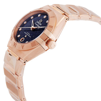 Sedna gold case with a sedna gold bracelet. Fixed sedna gold bezel. Blue dial with sedna gold hands and diamond hour markers. Dial Type: Analog. Date display at the 6 o'clock position. Omega Calibre 8701 automatic movement with a 50-hour power reserve. Scratch resistant sapphire crystal. Pull / push crown. Transparent see through case back. Round case shape, case size: 29 mm, case thickness: 12.2 mm. Butterfly clasp. Water resistant at 50 meters / 165 feet. Functions: date, hour, minute, second, co-axial escapement, chronometer. Constellation Series. Luxury watch style. Watch label: Swiss Made. Omega Constellation Automatic Chronometer Diamond Blue Dial Ladies Watch 131.50.29.20.53.003.