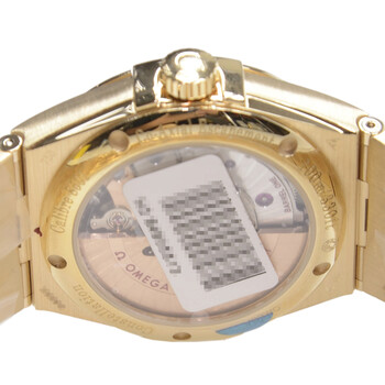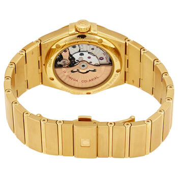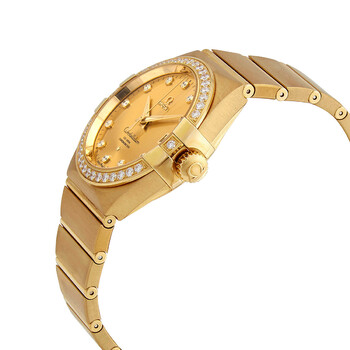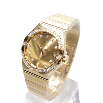 18kt yellow gold case with a 18kt yellow gold bracelet. Fixed 18kt yellow gold bezel set with 34 diamonds. Champagne dial with luminous yellow gold hands and diamond hour markers. Minute markers around the outer rim. Dial Type: Analog. Luminescent hands. Date display at the 3 o'clock position. Omega calibre 8501 automatic movement, based upon Omega 8500, containing 39 Jewels, bitting at 25200 vph, and has a power reserve of approximately 60 hours. Scratch resistant sapphire crystal. Pull / push crown. Transparent case back. Round case shape. Case size: 38 mm. Fold over clasp with a safety release. Water resistant at 100 meters / 330 feet. Functions: date, hour, minute, second, co-axial escapement, chronometer. Constellation Series. Luxury watch style. Watch label: Swiss Made. Omega Constellation Automatic Chronometer Diamond Champagne Dial Men's Watch 123.55.38.21.58.001.