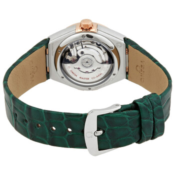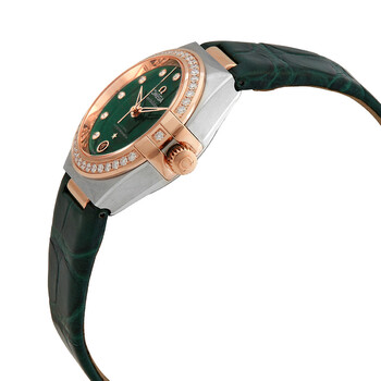 Silver-tone stainless steel case with a green leather strap. Fixed 18kt rose gold bezel set with diamonds. Green dial with rose gold-tone hands and diamond hour markers. Dial Type: Analog. Date display at the 6 o'clock position. Omega Calibre 8700 automatic movement with a 50-hour power reserve. Scratch resistant sapphire crystal. Pull / push crown. Transparent case back. Round case shape, case size: 29 mm. Band width: 17.6 mm. Water resistant at 50 meters / 165 feet. Functions: date, hour, minute, second, co-axial escapement, chronometer, magnetic resistant. Constellation Series. Luxury watch style. Watch label: Swiss Made. Omega Constellation Automatic Chronometer Diamond Green Dial Ladies Watch 131.28.29.20.99.001.