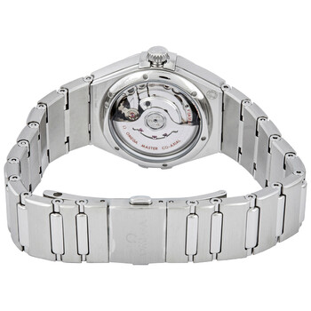 Stainless steel case with a stainless steel bracelet. Fixed stainless steel bezel set with diamonds. Mother of pearl dial with silver-tone skeleton hands and diamond hour markers. Dial Type: Analog. Date display at the 6 o'clock position. Omega calibre 8700 automatic movement with a 50-hour power reserve. Scratch resistant sapphire crystal. Pull / push crown. Transparent case back. Round case shape. Case size: 29 mm. Band width: 17.6 mm. Push button fold over clasp. Water resistant at 50 meters / 165 feet. Functions: date, hour, minute, second, co-axial escapement,chronometer. Dress watch style. Watch label: Swiss Made. Omega Constellation Automatic Chronometer Diamond Ladies Watch 131.15.29.20.55.001.