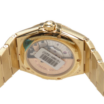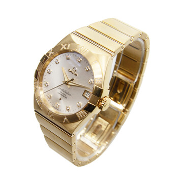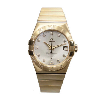 18kt yellow gold case and bracelet. Fixed 18kt yellow gold diamond-set bezel. Silver dial with gold-tone hands and diamond hour markers. Minute markers around the outer rim. Dial Type: Analog. Luminescent hands. Date display at the 3 o'clock position. Omega Calibre 8501 Automatic movement, based upon Omega 8500, containing 39 Jewels, bitting at 25200 vph, and has a power reserve of approximately 60 hours. Scratch resistant sapphire crystal. Transparent see through case back. Round case shape, case size: 38 mm. Band width: 25 mm. Water resistant at 100 meters / 330 feet. Functions: date, hour, minute, second, co-axial escapement, chronometer, magnetic resistant. Constellation Series. Luxury watch style. Watch label: Swiss Made. Omega Constellation Automatic Chronometer Diamond Silver Dial Men's Watch 123.55.38.21.52.008.