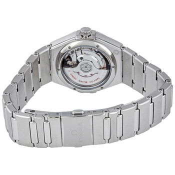 Stainless steel case with a stainless steel bracelet. Fixed stainless steel bezel set with diamonds. Silver dial with silver-tone skeleton hands and diamond hour markers. Dial Type: Analog. Date display at the 6 o'clock position. Omega calibre 8700 automatic movement with a 50-hour power reserve. Scratch resistant sapphire crystal. Pull / push crown. Transparent case back. Round case shape. Case size: 29 mm. Band width: 17.6 mm. Push button fold over clasp. Water resistant at 50 meters / 165 feet. Functions: date, hour, minute, co-axial escapement. Dress watch style. Watch label: Swiss Made. Omega Constellation Automatic Diamond Silver Dial Ladies Watch 131.15.29.20.52.001.