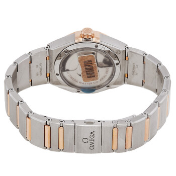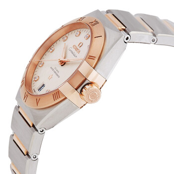 Stainless steel and 18kt sedna rose gold case and bracelet. Fixed 18k sedna™ gold bezel. Silver dial with 18k sedna™ gold hands and diamonds hour markers. Dial Type: Analog. Date display at the 6 o'clock position. Omega Calibre 8800 Automatic movement, containing 35 Jewels, bitting at 25200 vph, and has a power reserve of approximately 55 hours. Anti-reflective scratch resistant sapphire crystal. Pull / push crown. Transparent see through case back. Round case shape, case size: 36 mm. Band width: 22.2 mm. Push button folding clasp. Water resistant at 50 meters. Functions: date, hour, minute, second. Constellation Automatic Series. Luxury watch style. Watch label: Swiss Made. Omega Constellation Automatic Diamond Silver Dial Ladies Watch 13120362052001.