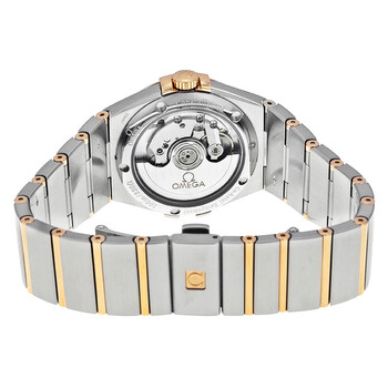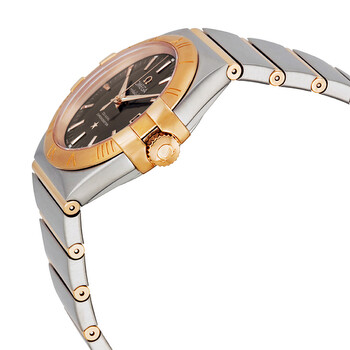 Stainless steel case with a stainless steel bracelet with 18kt rose gold bars. Fixed 18kt rose gold bezel. Grey dial with luminous rose gold-tone dauphine-style hands and index hour markers. Minute markers around the outer rim. Dial Type: Analog. Luminescent hands and markers. Date display at the 3 o'clock position. Omega calibre 2500 automatic movement, based upon ETA 2892-A2, containing 27 Jewels, bitting at 25200 vph, and has a power reserve of approximately 48 hours. Scratch resistant sapphire crystal. Pull / push crown. Transparent case back. Round case shape. Case size: 35 mm. Band width: 22 mm. Fold over clasp with a push button release. Water resistant at 100 meters / 330 feet. Functions: date, hour, minute, second, co-axial escapement, chronometer. Constellation Series. Luxury watch style. Watch label: Swiss Made. Omega Constellation Automatic Grey Dial Steel and 18kt Rose Gold Men's Watch 12320352006002.