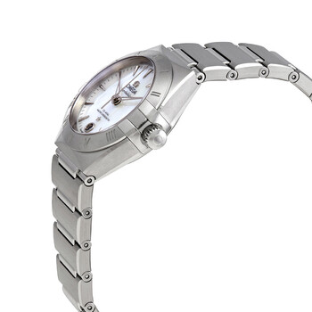 Stainless steel case with a stainless steel bracelet. Fixed stainless steel bezel. Mother of pearl dial with white gold hands and index hour markers. Minute markers around the outer rim. Dial Type: Analog. Date display at the 6 o'clock position. Omega calibre 8700 automatic movement with a 50-hour power reserve. Scratch resistant sapphire crystal. Pull / push crown. Transparent case back. Round case shape. Case size: 29 mm. Band width: 17.6 mm. Fold over clasp with a push button release. Water resistant at 50 metres / 167 feet. Functions: date, hour, minute, second. Constellation Automatic Series. Luxury watch style. Watch label: Swiss Made. Omega Constellation Automatic Ladies Watch 131.10.29.20.05.001.