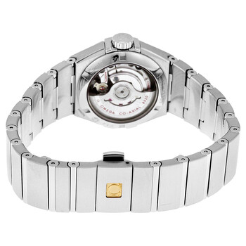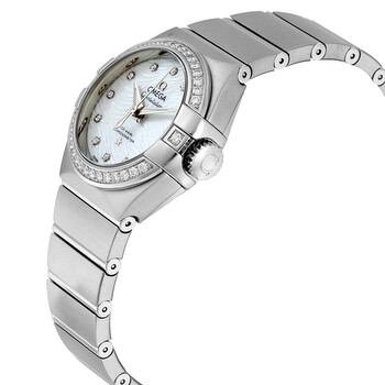 Stainless steel case with a stainless steel bracelet. Fixed stainless steel bezel set with 32 diamonds. Mother of pearl dial with luminous silver-tone dauphine-style shape hands and diamond hour markers. Dial Type: Analog. Luminescent hands. Date display at the 3 o'clock position. Omega calibre 8520 automatic movement, based upon Omega 8500, containing 28 Jewels, bitting at 25200 vph, and has a power reserve of approximately 50 hours. Scratch resistant sapphire crystal. Pull / push crown. Transparent case back. Round case shape. Case size: 27 mm. Case thickness: 9 mm. Band width: 18 mm. Fold over clasp with a push button release. Water resistant at 100 meters / 330 feet. Functions: date, hour, minute, second, chronometer. Luxury watch style. Watch label: Swiss Made. Omega Constellation Automatic Mother of Pearl Dial Ladies Watch 12315272055003.