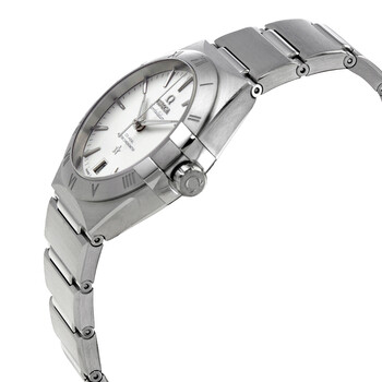 Stainless steel case with a stainless steel bracelet. Fixed stainless steel bezel. Silver dial with luminous 18kt white gold hands and index hour markers. Minute markers around the outer rim. Dial Type: Analog. Luminescent hands. Date display at the 6 o'clock position. Omega calibre 8800 automatic movement, containing 35 Jewels, bitting at 25200 vph, and has a power reserve of approximately 55 hours. Anti-reflective scratch resistant sapphire crystal. Pull / push crown. Transparent case back. Round case shape. Case size: 36 mm. Band width: 22.2 mm. Fold over clasp with a push button release. Water resistant at 50 meters. Functions: date, hour, minute, second. Constellation Automatic Series. Luxury watch style. Watch label: Swiss Made. Omega Constellation Automatic Silver Dial Ladies Watch 131.10.36.20.02.001.