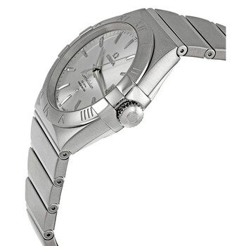 Stainless steel case with a stainless steel bracelet. Fixed stainless steel bezel. Silver dial with luminous silver-tone dauphine-style hands and index hour markers. Minute markers around the outer rim. Dial Type: Analog. Luminescent hands and markers. Date display at the 3 o'clock position. Omega calibre 8500 automatic movement, containing 39 Jewels, composed of 202 parts, bitting at 25200 vph, and has a power reserve of approximately 60 hours. Scratch resistant sapphire crystal. Pull / push crown. Transparent case back. Round case shape. Case size: 38 mm. Band width: 25 mm. Band length: 7 inches. Fold over clasp with a push button release. Water resistant at 100 meters / 330 feet. Functions: date, hour, minute, second, co-axial escapement, chronometer. Constellation Series. Dress watch style. Watch label: Swiss Made. Item Variations: 123 10 38 21 02 001, 123-10-38-21-02-001, 123/10/38/21/02/001, 12310382102001. Omega Constellation Automatic Silver Dial Men's Watch 12310382102001.