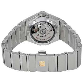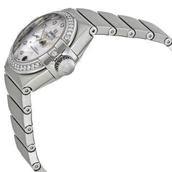 Stainless steel case with a stainless steel bracelet. Fixed stainless steel bezel set with diamonds. White mother of pearl dial with luminous silver-tone hands and diamond hour markers. Dial Type: Analog. Luminescent hands. Date display at the 6 o'clock position. Small seconds sub-dial. Omega calibre 8704 automatic movement, containing 28 Jewels, bitting at 25200 vph, and has a power reserve of approximately 50 hours. Scratch resistant sapphire crystal. Pull / push crown. Transparent case back. Round case shape. Case size: 27 mm. Case thickness: 9 mm. Band width: 17 mm. Band length: 7 inches. Fold over clasp. Water resistant at 100 meters / 330 feet. Functions: date, hour, minute, second, co-axial escapement, chronometer. Constellation Series. Luxury watch style. Watch label: Swiss Made. Omega Constellation Automatic White Mother of Pearl Dial Ladies Watch 127.15.27.20.55.001.