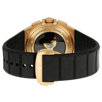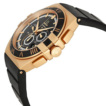 18kt rose gold case with a black rubber strap. Fixed black black and rose gold-tone bezel. Black dial with gold dauphine-style shape hands and index hour markers. Minute markers around the outer rim. Dial Type: Analog. Luminescent hands and markers. Date display between 4 and 5 o'clock position. Chronograph - three sub-dials displaying: 60 second, 30 minute and 12 hour. Omega Calibre 3890 Automatic movement, containing 33 Jewels, bitting at 28800 vph, and has a power reserve of approximately 52 hours. Scratch resistant sapphire crystal. Screw down crown. Transparent case back. Round case shape. Case size: 41 mm. Band width: 22.9 mm, band length: 9 inches. Deployment clasp. Water resistant at 100 meters / 330 feet. Functions: chronograph, date, day, hour, minute, second, co-axial escapement, chronometer. Luxury watch style. Watch label: Swiss Made. Item Variations: 121 62 41 50 01 001, 121-62-41-50-01-001, 121/62/41/50/01/001, 12162415001001. Omega Constellation Black Dial 18kt Rose Gold Black Rubber Automatic Men's Watch 121.62.41.50.01.001.