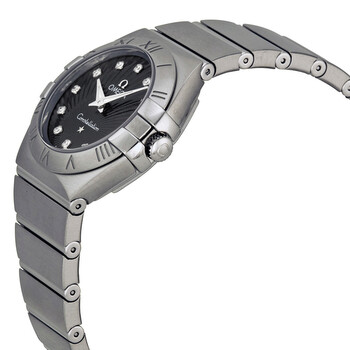 Silver-tone stainless steel case with a silver-tone stainless steel bracelet. Fixed silver-tone stainless steel bezel. Black dial with luminous silver-tone dauphine-style shape hands and diamond hour markers. Dial Type: Analog. Luminescent hands. Omega Calibre 1376 quartz movement with a 48 months power reserve. Scratch resistant sapphire crystal. Pull / push crown. Solid case back. Round case shape, case size: 27 mm, case thickness: 9 mm. Band width: 19 mm, band length: 7.5 inches. Deployment with push button release clasp. Water resistant at 100 meters / 330 feet. Functions: hour, minute. Casual watch style. Watch label: Swiss Made. Item Variations: 123 10 27 60 51 001, 123-10-27-60-51-001, 123/10/27/60/51/001, 12310276051001. Omega Constellation Black Dial Ladies Watch 123.10.27.60.51.001.