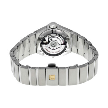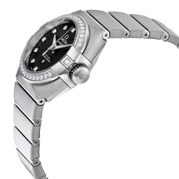 Silver-tone stainless steel case with a silver-tone stainless steel bracelet. Fixed silver-tone stainless steel set with diamonds bezel. Black dial with luminous silver-tone dauphine-style shape hands and diamond hour markers. Dial Type: Analog. Luminescent hands and markers. Date display at the 3 o'clock position. Omega Calibre 8520 Automatic movement, based upon Omega 8500, containing 28 Jewels, bitting at 25200 vph, and has a power reserve of approximately 50 hours. Scratch resistant sapphire crystal. Pull / push crown. Transparent case back. Round case shape, case size: 27 mm, case thickness: 9 mm. Band width: 17.5 mm, band length: 7 inches. Deployment with push button release clasp. Water resistant at 100 meters / 330 feet. Functions: date, hour, minute, second, chronometer. Casual watch style. Watch label: Swiss Made. Item Variations: 123 15 27 20 51 001, 123-15-27-20-51-001, 123/15/27/20/51/001, 12315272051001. Omega Constellation Chronometer Automatic Diamond Ladies Watch 123.15.27.20.51.001.