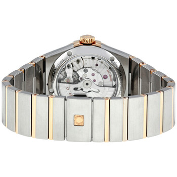 Silver-tone stainless steel case with a two-tone (silver-tone and rose gold-tone) stainless steel & 18kt rose gold bracelet. Fixed roman numeral 18kt rose gold bezel. Silver dial with luminous rose gold-tone dauphine-style shape hands and diamond hour markers. Minute markers around the outer rim. Dial Type: Analog. Luminescent hands. Date display at the 3 o'clock position. Omega Calibre 8500 Automatic movement, containing 39 Jewels, composed of 202 parts, bitting at 25200 vph, and has a power reserve of approximately 60 hours. Anti-reflective scratch resistant sapphire crystal. Pull / push crown. Skeleton case back. Round case shape, case size: 38 mm. Band width: 25 mm. Fold over with safety release clasp. Water resistant at 100 meters / 330 feet. Functions: date, hour, minute, second, co-axial escapement, chronometer. Constellation Chronometer Series. Luxury watch style. Watch label: Swiss Made. Item Variations: 123 20 38 21 52 001, 123-20-38-21-52-001, 123/20/38/21/52/001, 12320382152001. Omega Constellation Chronometer Automatic Men's Watch 123.20.38.21.52.001.
