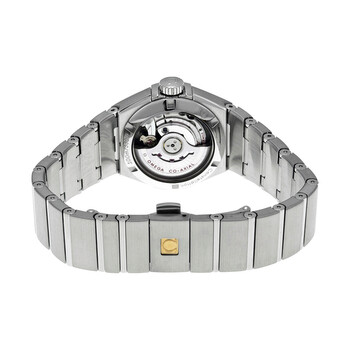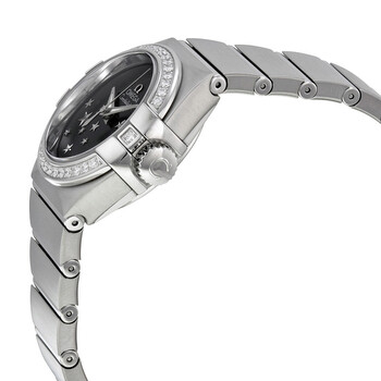 Stainless steel case with a stainless steel bracelet. Fixed stainless steel bezel set with diamonds. Black (bevelled polished steel stars) dial with luminous silver-tone dauphine-style hands. No markers. Dial Type: Analog. Luminescent hands. Date display at the 3 o'clock position. Omega calibre 8520 automatic movement, based upon Omega 8500, containing 28 Jewels, bitting at 25200 vph, and has a power reserve of approximately 50 hours. Scratch resistant sapphire crystal. Pull / push crown. Transparent case back. Round case shape. Case size: 27 mm. Case thickness: 10 mm. Band width: 17 mm. Band length: 6 inches. Fold over clasp with a safety release. Water resistant at 100 meters / 330 feet. Functions: date, hour, minute, second, chronometer. Dress watch style. Watch label: Swiss Made. Item Variations: 12315272001001. Omega Constellation Chronometer Automatic Star Ladies Watch 123.15.27.20.01.001.