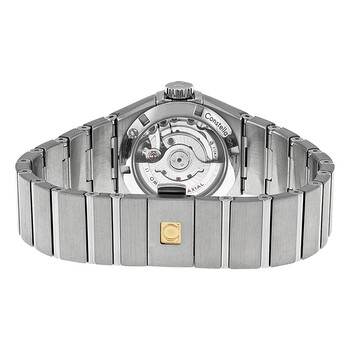 Silver-tone stainless steel case with a silver-tone stainless steel bracelet. Fixed roman numeral silver-tone stainless steel bezel. Black textured dial with silver-tone hands and diamond hour markers. Dial Type: Analog. Date display at the 3 o'clock position. Omega Calibre 8520 Automatic movement, based upon Omega 8500, containing 28 Jewels, bitting at 25200 vph, and has a power reserve of approximately 50 hours. Scratch resistant sapphire crystal. Pull / push crown. Skeleton case back. Round case shape, case size: 27 mm, case thickness: 9 mm. Fold over with push button release clasp. Water resistant at 100 meters / 330 feet. Functions: date, hour, minute, second, chronometer. Dress watch style. Watch label: Swiss Made. Item Variations: 12310272051001. Omega Constellation Chronometer Black Dial Stainless Steel Ladies Watch 123.10.27.20.51.001.