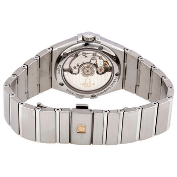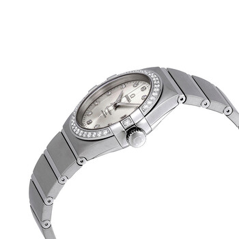 Stainless steel case with a stainless steel bracelet. Fixed stainless steel bezel set with diamonds. Silver dial with luminous silver-tone dauphine-style shape hands and diamond hour markers. Minute markers around the outer rim. Dial Type: Analog. Luminescent hands. Date display at the 3 o'clock position. Omega calibre 2500 automatic movement, based upon ETA 2892-A2, containing 27 Jewels, bitting at 25200 vph, and has a power reserve of approximately 48 hours. Scratch resistant sapphire crystal. Pull / push crown. Transparent case back. Round case shape. Case size: 35 mm. Band width: 23 mm. Fold over clasp with a push button release. Water resistant at 100 meters / 330 feet. Functions: date, hour, minute, second, co-axial escapement, chronometer. Constellation Co-axial Series. Dress watch style. Watch label: Swiss Made. Omega Constellation Co-Axial Automatic Chronometer Diamond Silver Dial Ladies Watch 123.15.35.20.52.001.