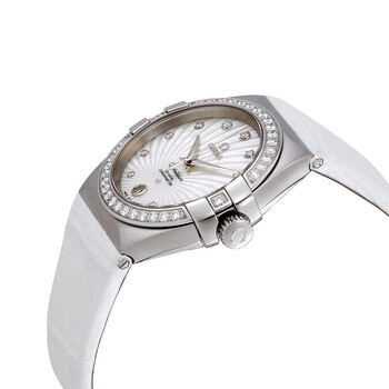 Stainless steel case with a white leather strap. Fixed stainless steel bezel set with 34 diamonds. White mother of pearl dial with luminous silver-tone dauphine-style hands and diamond hour markers. Dial Type: Analog. Luminescent hands. Date display at the 6 o'clock position. Omega calibre 2500 automatic movement, based upon ETA 2892-A2, containing 27 Jewels, bitting at 25200 vph, and has a power reserve of approximately 48 hours. Scratch resistant sapphire crystal. Pull / push crown. Transparent case back. Round case shape. Case size: 35 mm. Band width: 24 mm. Fold over clasp with a push button release. Water resistant at 100 meters / 330 feet. Functions: date, hour, minute, second, co-axial escapement, chronometer. Constellation Co-axial Series. Luxury watch style. Watch label: Swiss Made. Omega Constellation Co-Axial Automatic Chronometer Diamond White Mother of Pearl Dial Ladies Watch 123.18.35.20.55.001.
