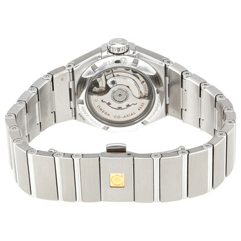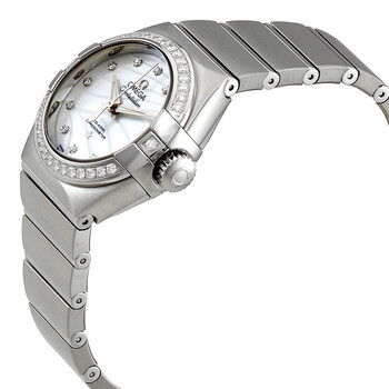 Stainless steel case with a stainless steel bracelet. Fixed stainless steel bezel set with diamonds. White mother of pearl (wavy pattern) dial with luminous silver-tone dauphine-style hands and diamond hour markers. Dial Type: Analog. Luminescent hands. Date display at the 3 o'clock position. Omega calibre 8520 automatic movement, based upon Omega 8500, containing 28 Jewels, bitting at 25200 vph, and has a power reserve of approximately 50 hours. Scratch resistant sapphire crystal. Pull / push crown. Transparent case back. Round case shape. Case size: 27 mm. Case thickness: 9 mm. Band width: 17.1 mm. Fold over clasp with a push button release. Water resistant at 100 meters / 330 feet. Functions: date, hour, minute, second, chronometer. Additional Info: suitable for snorkeling, as well as swimming, but not diving. Constellation Co-axial Series. Luxury watch style. Watch label: Swiss Made. Item Variations: 123 15 27 20 55 002, 123-15-27-20-55-002. Omega Constellation Co-Axial Automatic Mother of Pearl Dial Ladies Watch 123.15.27.20.55.002.