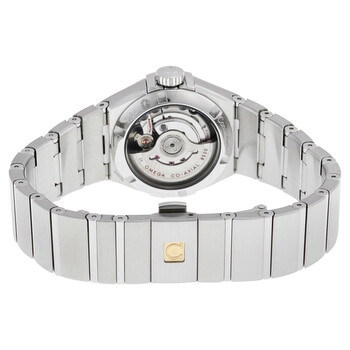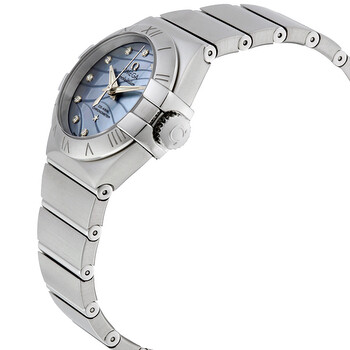 Stainless steel case with a stainless steel bracelet. Fixed stainless steel bezel. Blue mother of pearl (wavy pattern) dial with luminous silver-tone dauphine-style hands and diamond hour markers. Dial Type: Analog. Luminescent hands. Date display at the 3 o'clock position. Omega calibre 8520 automatic movement, based upon Omega 8500, containing 28 Jewels, bitting at 25200 vph, and has a power reserve of approximately 50 hours. Scratch resistant sapphire crystal. Pull / push crown. Skeleton case back. Round case shape. Case size: 27 mm. Case thickness: 9 mm. Band width: 17.8 mm. Band length: 7 inches. Fold over clasp with a push button release. Water resistant at 100 meters / 330 feet. Functions: date, hour, minute, second, chronometer. Constellation Co-axial Series. Luxury watch style. Watch label: Swiss Made. Item Variations: 123 10 27 20 57 001, 123-10-27-20-57-001, 123/10/27/20/57/001, 12310272057001. Omega Constellation Co-Axial Blue Mother of Pearl Diamond Dial Ladies Watch 123.10.27.20.57.001.