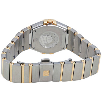 Stainless steel case with a stainless steel with 18kt yellow gold bars. Fixed 18kt yellow gold bezel. Coral mother of pearl dial with gold-tone hands and diamond hour markers. Dial Type: Analog. Omega calibre 1376 quartz movement. Scratch resistant sapphire crystal. Solid case back. Case size: 27 mm. Case thickness: 9 mm. Round case shape. Band width: 17 mm. Fold over clasp with a push button release. Water resistant at 100 meters / 330 feet. Functions: hour, minute. Luxury watch style. Watch label: Swiss Made. Omega Constellation Coral Dial Ladies Watch 123.20.27.60.57.005.