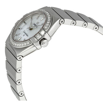 Stainless steel case with a stainless steel bracelet. Fixed stainless steel bezel set with 28 diamonds. Mother of pearl dial with silver-tone hands and index hour markers. The Omega name appears below the 12 o'clock position. Quartz movement. Scratch resistant sapphire crystal. Textured steel crown. Solid case back. Case diameter: 27 mm. Case thickness: 9 mm. Fold over clasp with push button release. Water resistant at 100 meters / 330 feet. Omega Constellation Diamond Ladies Watch 12315276005002
