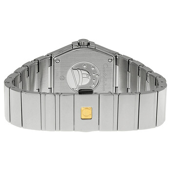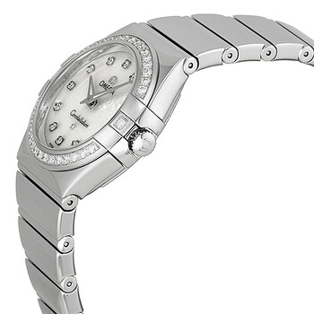 Stainless steel case with a stainless steel bracelet. Fixed silver-tone bezel set with diamonds. Mother of pearl dial with silver-tone hands and diamond hour markers. Dial Type: Analog. Luminescent hands. Quartz movement. Scratch resistant sapphire crystal. Solid case back. Case diameter: 27 mm. Round case shape. Deployment clasp with push button. Water resistant at 100 meters / 330 feet. Functions: hour, minute. Luxury watch style. Watch label: Swiss Made. Omega Constellation Diamond Mother of Pearl Dial Stainless Steel Ladies Watch 12315276055003.