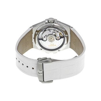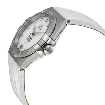 Stainless steel case with a white leather strap. Fixed stainless steel bezel. White mother of pearl dial with silver-tone dauphine-style hands and diamond hour markers. Dial Type: Analog. Luminescent hand. Date display at the 6 o'clock position. Omega calibre 2500 automatic movement, based upon ETA 2892-A2, containing 27 Jewels, bitting at 25200 vph, and has a power reserve of approximately 48 hours. Scratch resistant sapphire crystal. Pull / push crown. Skeleton case back. Round case shape. Case size: 35 mm. Case thickness: 10 mm. Band width: 20 mm. Band length: 6 inches. Deployment clasp. Water resistant at 100 meters / 330 feet. Functions: date, hour, minute, second, co-axial escapement, chronometer. Constellation Series. Dress watch style. Watch label: Swiss Made. Item Variations: 123 13 35 20 55 001, 123-13-35-20-55-001, 123/13/35/20/55/001, 12313352055001. Omega Constellation Ladies Watch 123.13.35.20.55.001.