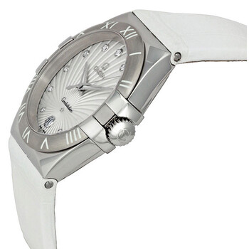 Stainless steel case with a white leather strap. Fixed stainless steel bezel set with diamonds. White guilloche dial with luminous silver-tone hands and diamond hour markers. Dial Type: Analog. Luminescent hands. Date display at the 6 o'clock position. Omega calibre 1532 quartz movement. Scratch resistant sapphire crystal. Solid case back. Round case shape. Case size: 35 mm. Case thickness: 8.5 mm. Band width: 24 mm. Deployment clasp. Water resistant at 100 meters / 330 feet. Functions: date, hour, minute, second, battery eol indicator. Additional Info: in general, suitable for swimming and snorkeling, but not scuba diving. Dress watch style. Watch label: Swiss Made. Item Variations: 123 13 35 60 52 001, 123-13-35-60-52-001, 123/13/35/60/52/001, 12313356052001. Omega Constellation Ladies Watch 123.13.35.60.52.001.