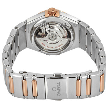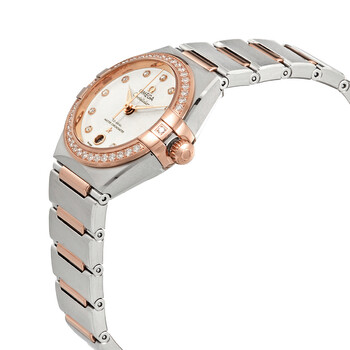 Stainless steel case with a stainless steel cracelet with 18k sedna gold links. Fixed 18k sedna gold bezel set with diamonds. Silver dial with rose gold-tone skeleton hands and diamond hour markers. Dial Type: Analog. Date display 6 o'clock position. Omega Co-Axial Master Chronometer calibre 8700 automatic movement with a 50-hour power reserve. Scratch resistant sapphire crystal. Screw down crown. Transparent case back. Round case shape. Case size: 29 mm. Band width: 17.6 mm. Fold over clasp. Water resistant at 50 meters / 165 feet. Functions: date, hour, minute, chronometer. Constellation Manhattan Series. Dress watch style. Watch label: Swiss Made. Omega Constellation Manhattan Automatic Chronometer Diamond Silver Dial Ladies Watch 131.25.29.20.52.001.